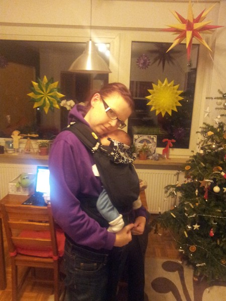 Heute Vormittag haben Mama und Papa ihr Vorhaben in die Tat umgesetzt und für ihren Benni ein Tragesystem namens „Fräulein Hübsch“ gekauft. Ja, es heißt wirklich so 😉 Hier in Hannover gibt es einen „Trageladen“ speziell für diese Tragesysteme. Dabei wurden sie sehr nett und kompetent beraten und konnten allerlei Modelle ausprobieren – zuerst zum üben mit einer Puppe, dann zum ultimativen Test mit Benni. Mama und Papa hatten sich rasch entschieden und so können sie sich ihn ab sofort vor die Brust schnallen, wenn er mal wieder nur herum getragen werden möchte.