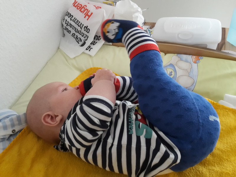 Hach ja, Benni macht weiter riesige Fortschritte in seiner Entwicklung – und das wie gewohnt in einer wahnsinnigen Geschwindigkeit. Seit Dienstag hat er nun seine Füßchen entdeckt und schafft es mittlerweile auch sie in den Mund zu stecken. Das bedeutet ab sofort natürlich auch, dass seine Söckchen vor ihm nicht mehr sicher sind 😉