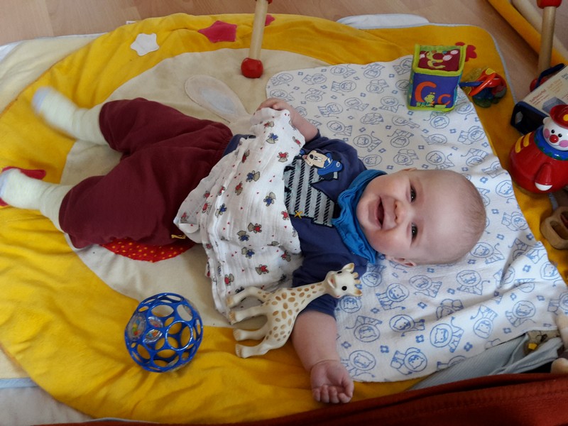Zur Zeit kann Benni nicht genug vom Auf-den-Bauch-drehen bekommen. Kaum auf den Rücken auf seine Krabbeldecke gelegt, schwupps wird sich sofort auf den Bauch gedreht. Natürlich wird nach einiger Zeit gemeckert wenn die Kraftreserven nachlassen. Dreht man ihn dann wieder auf den Rücken, geht es unverzüglich wieder auf den Bauch. Das soll einer verstehen. Was aber unheimlich nervt ist das permanente Gespucke. Die Mutti kommt meist nicht schnell genug mit dem Molltontuch hinterher zum Auffangen 😉