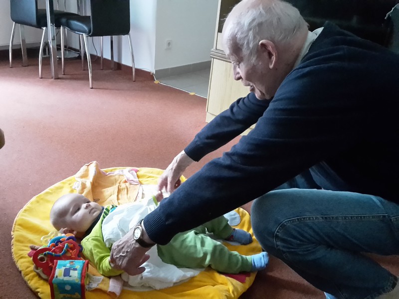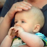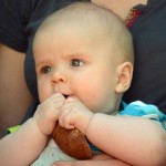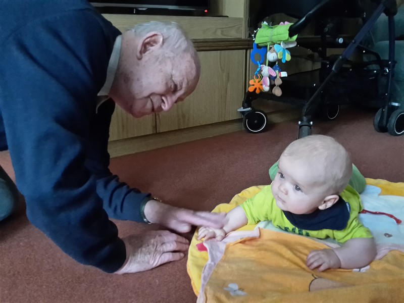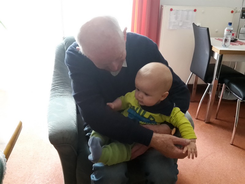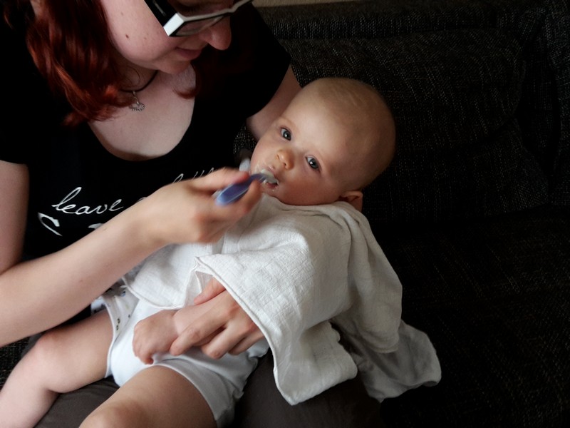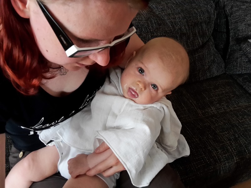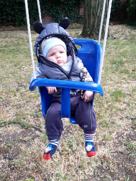 Benni erkundet nach wie vor seine Umwelt mit seinen großen Stauneaugen, die jetzt immer grünlicher werden. Nur einfach so im Kinderwagen oder Laufgitter liegen und spielen ist auch nicht mehr. Benni möchte jetzt auch am gesellschaftlichen Leben Teil haben und so sitzt er immer mehr mit am Kaffeetisch.