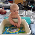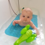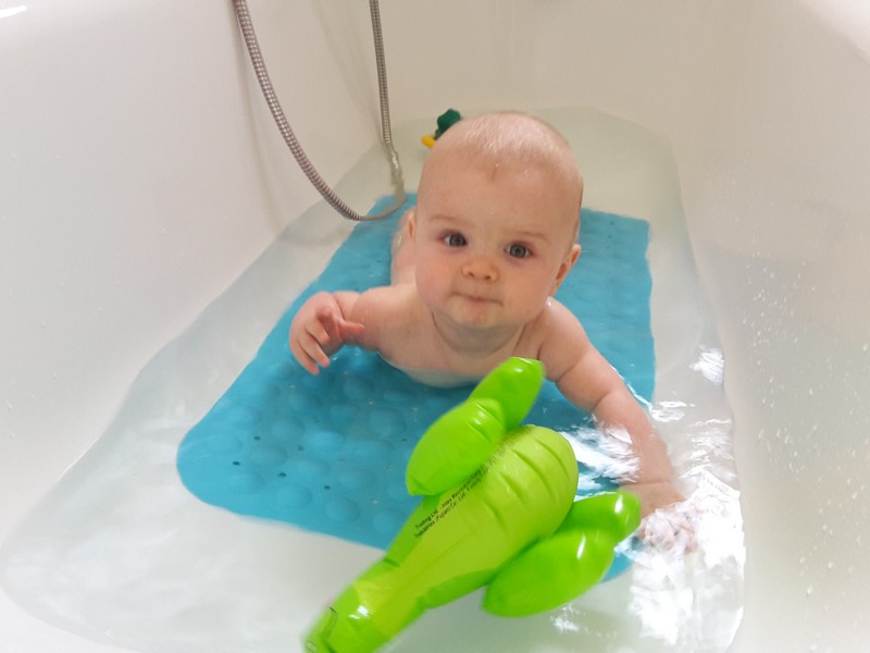 Der Benni liebt nach wie vor unheimlich sein abendliches Baderitual. Ursprünglich gedacht als Entspannungsbad in der Zeit seines bösen Bauchwehs, hat sich das Baden bis heute als abendliches Ritual etabliert. Schon beim Ausziehen auf dem Wickeltisch juchzt er und kann es kaum erwarten. Einmal in der Wanne wird wie wild gezappelt, was das Waschen mitunter sehr schwierig macht – mehr als eine kurze Katzenwäsche ist kaum möglich 😉 Danach wird sich auf den Bauch gedreht und das Plantschen und Spielen beginnt. Das ist mittlerweile so heftig, dass sowohl Mama und Papa mit baden und das Badezimmer regelrecht geflutet wird 😉