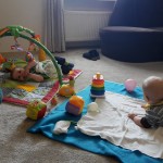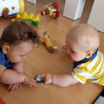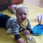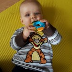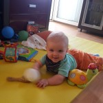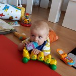 Spielen Hier hat Benni die meisten Fortschritte gemacht. Es ist der helle Wahnsinn, wie sich Benni in den letzten 4 Wochen entwickelt hat. Auf dem Rücken liegen ist ja sowas von uncool geworden und die Bauchlage wird langsam auch langweilig. Am Liebsten ist er bei Mama und Papa auf dem Arm oder tobt wild mit ihnen herum. Er ist so agil und hat einen schier unstillbaren Bewegungsdrang. Er kreiselt sich wie wild umher und mittlerweile gibt es kaum noch etwas, was im Wohnzimmer nicht vor ihm sicher ist 🙂 Immer öfter bekommt er seinen Popo in die Luft und versucht sich irgendwie vorwärts zu bewegen. Am Besten kommt er allerdings abseits seiner Krabbelmatte auf dem Laminat vorwärts. Er lässt sich sehr schnell für etwas begeistern und sei es nur durch eine Plastikflasche oder ein mit Reiskörnern gefüllter Joghurtbecher. Benni geht allem auf den Grund und muss alles genau untersuchen 😉