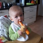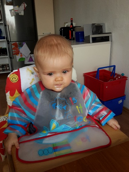 Essen In dieser Kategorie hat Benni gewaltige Fortschritte gemacht. Er braucht mittlerweile nur noch eine Milchflasche am Tag. Sonst isst er schon wie ein ganz Großer. Seit gut 1 Woche sitzt er nun nicht nur einfach so mit Mama und Papa am Esstisch, sondern isst sein Frühstück wie ein großer Junge. Im Moment mampft Benni am Liebsten Filinchen oder Toast mit Schmelzkäse oder Butter. Mittags gibt es nach wie vor Muttis selbstgekochten Powerbrei 🙂 . Am Nachmittag gibt es diversen Obstbrei und Abends seinen heiß geliebten Milchbrei. Sein Hunger schwankt dabei sehr – aber die Erwachsenen haben ja schließlich auch nicht immer den gleichen Appetit 😉