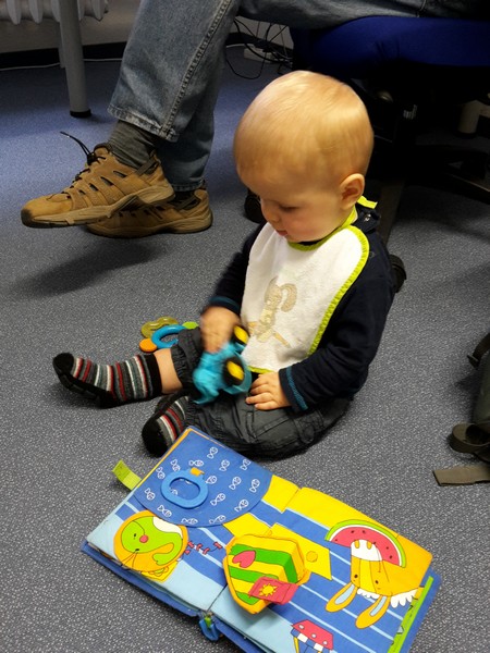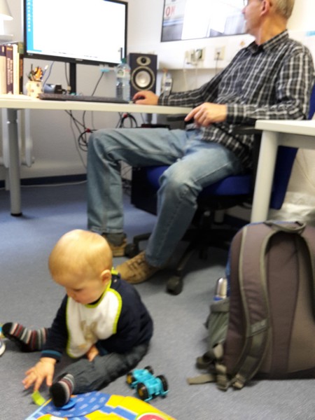 Gestern ging es für Benni nach sehr langer Zeit einmal wieder zu Opi Roland auf Arbeit. Da wurde er schon sehnsüchtig von seinen Kollegen erwartet. Und wie sollte es auch anders sein – Benni war irre gut drauf und strahlte in einer Tour. Besonders „Oma Marion“ hatte es ihm angetan und so schäkerten Beide ganz süß miteinander 🙂 Benni lernte jede Menge neue Leute kennen, fremdelte aber überhaupt nicht. Er spielte ganz lieb in Opis Arbeitszimmer und robbte eifrig durch die Gegend. Ein besonderes Highlight war, als Benni vom Opi seine coolen Kopfhörer aufgesetzt bekam. Er lauschte so mit ganz großen Augen Beethovens Klängen 😉 Noch schnell seinen Brei im Cosi gefüttert ging es dann auch wieder nach Hause und ab ins Bettchen zum Mittagsschlaf.
