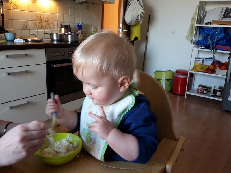 Benni hat eine neue und sehr effektive Methode entwickelt, um sein Essen möglichst schnell und effizient in seinen Mund zu befördern – die Zwei-Hand-Schaufel-Technik. Grundvoraussetzung hierfür ist ausreichend vorhandenes Essen. Dann wird der kleine Schaufelbagger an geschmissen. Benni nimmt in jede Hand ein Objekt seiner Begierde und ab geht es Richtung Mund. Kaum dort abgeliefert wird sofort wieder für Nachschub in der leeren Hand gesorgt und weiter geht es. Und wehe, der Essensnachschub stockt – dann kommt Maschinerie ins Stocken und das Geschrei ist groß 😉