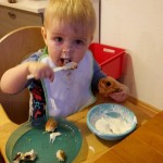 Mama und Papa haben seit einigen Tagen ihre Strategie bezüglich des Abendbrotes beim Benni geändert. Gerade das Abendessen war in letzter Zeit immer von viel Theater und Knatsch geprägt. Er wollte immer unbedingt alles das haben, was auf dem Tisch stand – und das war nicht wenig. Er konnte sich nie wirklich auf das Essen konzentrieren und Mama und Papa auch nicht. Nun wird erst einmal wieder getrennt gegessen. Für Benni wird sein Teller mit allerhand Leckereien und einem Schnittchen vorbereitet – und nur den bekommt er dann auch. Seitdem sie das machen, ist das Essen deutlich entspannter geworden und Benni isst sogar ganz lieb und brav sein Schnittchen. Mama und Papa sitzen trotzdem wie immer mit am Tisch, nur gehört ihre Aufmerksamkeit gänzlich ihrem Spatz 🙂