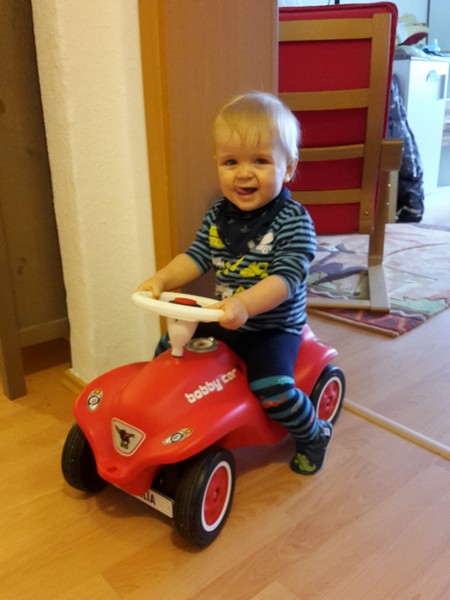 Benni liebt einfach im Moment sein feuerrotes Bobbycar. Er ist schon enorm geübt darin und kann gar nicht genug vom Fahren bekommen. Aber mit einem hat die Mutti nun gar nicht gerechnet – Benni benutzt das Lenkrad und lenkt völlig bewusst und richtig seinen kleinen Flitzer. Die Mama hatte das anfangs für einen Zufall gehalten, aber weit gefehlt. Wie ein Vollprofi fährt er vom Kinderzimmer über den Flur ins Wohnzimmer und Arbeitszimmer und zurück. Eckt er einmal irgendwo an wird kurz geknatscht, danach rückwärts ausgeparkt, gelenkt und weiter gefahren. Ab und zu reicht ein kurzes Lenkkommando und Benni lenkt in die richtige Richtung 🙂 Einfach irre, dass er das jetzt schon kann 🙂