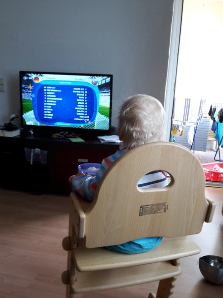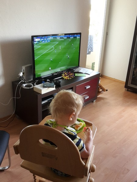Im Moment läuft ja in Frankreich die Fußball-EM. Die meisten Spiele, auch die der deutschen Mannschaft, liefen bisher zur Primetime. Da diese genau in die Benni-Abendbrot-Ins-Bett-Geh-Zeit fiel, machten Mama und Papa kurzen Prozess, sodass das Abendbrot einfach ins Wohnzimmer verlegt wurde. So wurden gleich 2 Fliegen mit einer Klappe geschlagen – Benni aß ganz brav sein Abendbrot und Mama und Papa konnten zumindest in Ruhe die erste Halbzeit gucken. Benni fand das natürlich total klasse und mampfte im Angesicht diverser Spiele. Er zeigte durchaus Begeisterung und wartete auch mit Fachwissen auf – er kommentierte fleißig die Spiele mit „Ball“ und „ooohhh“ (wenn ein Tor fiel). Als Benni jedoch wieder mit seinem „Auto Auto“ ankam, hielten ihn seine Eltern für etwas verrückt. Nach vehementem Protest von ihnen, nahmen sie diesen unverzüglich zurück. An der Bandenwerbung außen am Spielfeldrand flackerte eine Autowerbung mit einem kleinen fahrenden Auto auf 😉 😉 😉