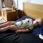 Der Benni scheint gerade wieder mit neuen Zähnchen zu kämpfen. Die letzten Nächte waren extrem unruhig und er schrie immer wieder heftig vor Schmerzen. Natürlich gibt es dann seinen Schmerzsaft und seine Flasche zur Beruhigung. Gestern Abend war es dann wieder soweit. Nur, dass er diesmal nicht wie gewohnt wieder eingeschlafen ist, sondern putzmunter in seinem Bettchen herum tobte. Da Mama und Papa eh das Deutschlandspiel im Schlafzimmer schauten, durfte Benni dann auch mit ins Bett und mit gucken. Dort drehte er dann aber so richtig auf und war kaum zu bremsen. Gegen Mitternacht hatten Mama und Papa dann doch die Nase voll und schafften es ihn vom Schlafen zu überzeugen 😉