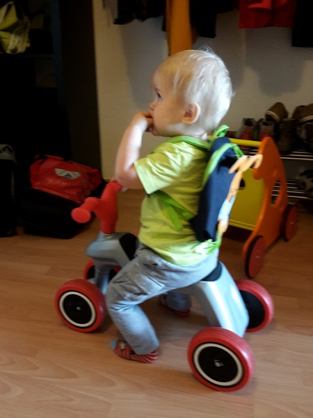 Benni hat im Moment das „Hallo“ für sich entdeckt. Erst jetzt am Wochenende ist er den halben Vormittag mit seinem Lauflernrad durch die Wohnung gefahren und sagte immer „Hallo“, wenn er die Mama gesehen hat. Dabei versteckte er sich immer wieder hinter der Tür und kam hervor gerollt. Erwiderte man sein „Hallo“, freute Benni sich wahnsinnig und grinste einen über beide Mopsbacken an. Heute in der Krippe machte er weiter mit dem Spielchen und sagte beim Abholen einfach jedem Kind und jedem Erwachsenen „Hallo“, den er gesehen hat 🙂