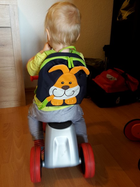 Nun hat Benni endlich seinen eigenen Rucksack für die Krippe. Bisher hatte er nur einen Turnbeutel für Schmutzsachen vor Ort. Passend zu seinem Schnuffelhasen wählte die Mama einen ultra coolen Rücksack mit einem Häschen aus. Benni durfte ihn gleich umschnallen und fuhr mit ihm den halben Nachmittag mit seinem Auto spazieren. Nun begleitet ihn sein kleiner Häschenrucksack immer in die Krippe – gepackt mit seinem Schnuffelhasen und einer Hand voll Autos 😉