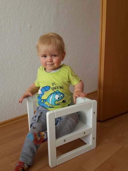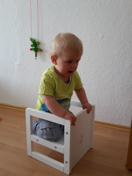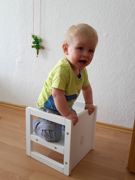 Im Rahmen einer kleineren Umgestaltung haben Mama und Papa ihrem Benni einen tollen Hocker gekauft. Der soll ab sofort zum An-und Ausziehen seiner Schuhe genutzt werden. Am Wochenende half er seinen Hocker mit aufzubauen und wollte ihn gleich ausprobieren. Der Clou ist, dass der Hocker durch Drehen in unterschiedliche Positionen mehrere Sitzhöhen einstellbar sind – voll genial. Benni war gleich Feuer und Flamme und kletterte in einer Tour rauf und runter – und das komplett alleine und ohne dass ihm das Mama oder Papa vorher gezeigt haben. Natürlich verlangte er nach jeder erfolgreicher Besteigung seine gewohnte Belohnung in Form von Applaus 🙂