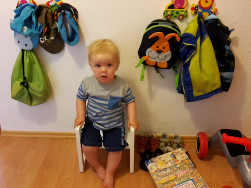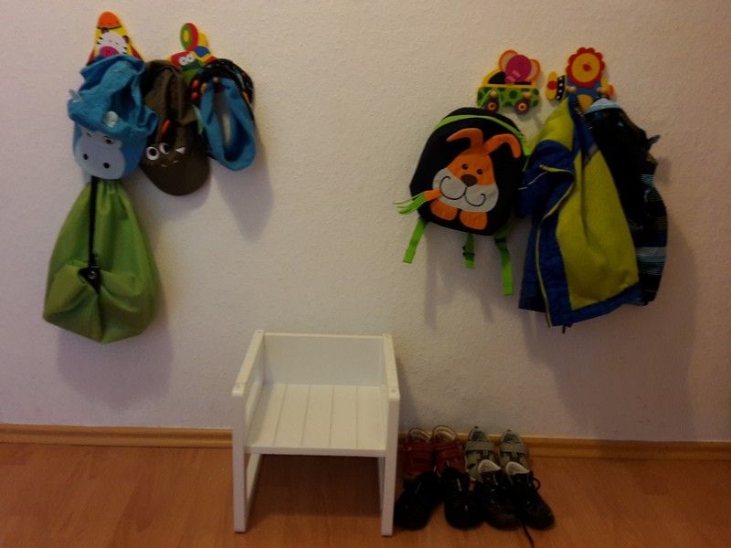 Pünktlich zum Kindertag hat der Benni, etwas vorfristig, seine eigene neue Garderobe im Flur bekommen. Nachdem der neue Hocker bereits aufgebaut und getestet wurde, machte die Mama am Wochenende noch die neue Kleiderhaken an. Benni wollte natürlich unbedingt mit helfen und schnappte sich auch gleich den Akkuschrauber. Noch schnell die Schuhablage positioniert konnte das Werk bestaunt und auch gleich ausprobiert werden. Bisher klappt das ganz ausgezeichnet. So bleibt der ganze Dreck und der Sand aus dem Sandkasten im Flur und gelangt nicht bis in Bennis Kinderzimmer.