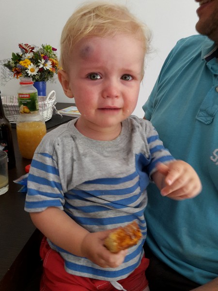 Und da ist es passiert – Benni hat vorgestern seine erste richtige Beule bekommen – und was für eine. Es war eigentlich alles recht harmlos gewesen. Tante Sandra spielte mit ihm ganz lieb Kuckuck mit dem Auto. Als Benni dann dem Auto hinter her schauen wollte, waren seine Ärmchen zu kurz und der Kopf zu schwer. Es machte kurzer Hand ganz laut bautz und im nu kam ein dickes fettes Hörnchen zum Vorschein. Benni brüllte ordentlich und der Mama rutschte kurz das Herz in die Hose. Das Ergebnis sah aber auch übel aus – man man man. Die Mama ließ ihren Spatz die ganze Nacht nicht aus den Augen und hielt Wache an seinem Bettchen. Benni schlief sehr sehr unruhig und wachte immer wieder weinend auf, wenn er auf seiner Beule lag. Am nächsten Tag dann sah alles nicht mehr ganz so schlimm aus und Benni konnte ganz normal in die Krippe gehen 🙂