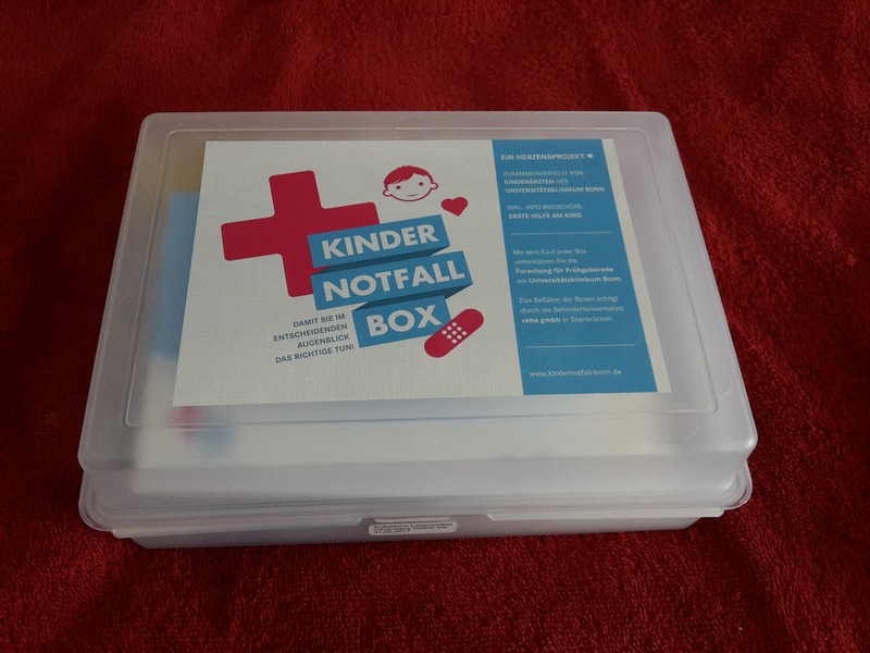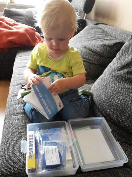 Die Mama ist beim surfen im Internet auf eine Kinder-Notfall-Box gestoßen. Die wurde von Kinderärzten der Uniklinik Bonn entwickelt. Der Erlös fließt komplett in die Frühchen-Forschung der Uni. Natürlich wurde die Box gleich ausgiebig von Benni inspiziert. Darin enthalten sind: 1 Verbandsschere, 1 Splitterpinzette, 1 Packung Gummibärchen, 1 digitales Fieberthermometer, 1 Zeckenkarte mit Lupe, 1 Zahnrettungsbox, 1 Kalt/Warmkompresse, 1 Einmalhandschuhe, 1 Pflasterbinde, Wundpflaster, Wundverband, Vlieskompressen, 1 Infobroschüre „Erste Hilfe am Kind“…also alles was man bei kleineren Unfällen benötigt 🙂 Auf das Mama und Papa nur die Gummibärchen brauchen werden 😉