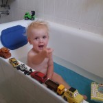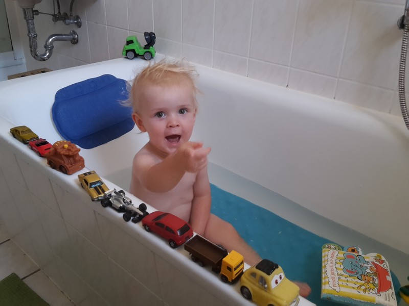 Bennis Automanie hat nun auch das Badezimmer erreicht. Der neueste Hit ist vor dem Baden mit seinen Autos „hui“ zu spielen. Dabei werden seine Autos (mittlerweile sind die voll auf wasserfest umgestellt) auf dem Wannenrand platziert und nacheinander mit einem freudigen „hui“ in die Badewanne geschupst. Und ja, der Benni geht danach auch noch selber in die Wanne 😉