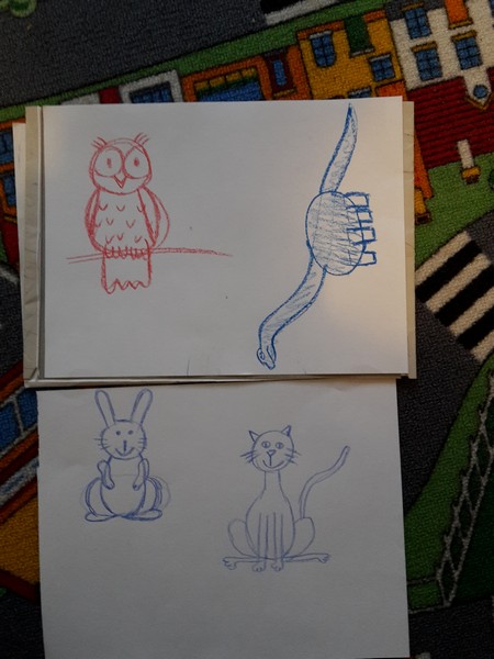 Die Mama hat so langsam aber sicher die Nase voll. Ständig muss sie Autos malen – egal wo. Jegliche Versuche so etwas wie eine Sonne oder gar Blume zum Besten zu geben sind kläglich gescheitert und werden von Benni mit den Worten „Mama Auto“ oder „nein Mama“ kommentiert. Schafft sie es dann doch einmal in einem unbeobachteten Moment etwas Auto fremdes zu zeichnen wird es sofort von ihm übermalt. Jetzt hat Mama einen neuen Anlauf in Sachen „Auto freie Zone“ gestartet und sich ein Buch mit dem Titel „Tiere zeichnen leicht gemacht“ besorgt. Das ist aus der selben Reihe wie schon das Automalbuch. Und siehe da, die Mama durfte heute Nachmittag fleißig Tiere zu Papier bringen. Das Schaf, der Hase, die Katze und die Eule wurden sofort erkannt (und NICHT sofort übermalt). Das lässt doch hoffen 😉