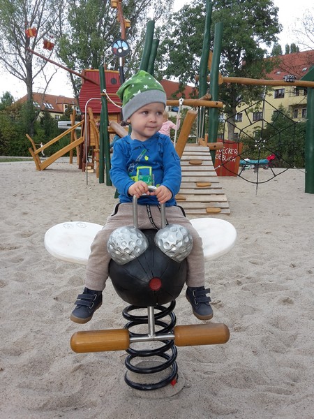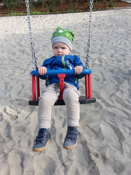 Bewegung In dieser Kategorie hat Benni die größten Fortschritte gemacht, denn er läuft seit Ende Juli endlich alleine 🙂 Anfangs noch sehr wackelig und tapsig, läuft und ja rennt er sogar jetzt schon umher. Er läuft jetzt so sicher und mit Freude, als wäre es das Einfachste für ihn und vorher nichts gewesen 😉 Er klettert jetzt immer mehr und öfter auf alles hoch, aber immer mit Bedacht und mit Köpfchen. Besonders beliebt ist das tägliche Toben mit Mama und Papa. Ohne Rücksicht auf Verluste werden sie dann als Klettertürme „missbraucht“. Da wird schon einmal auf dem Rücken vom Papa durch die Wohnung geritten oder mit der Mama Flugzeug gespielt 🙂 Mama und Papa versuchen ihren Spatz soviel wie möglich selber machen zu lassen und nur wenig einzugreifen. Jetzt werden diesen Herbst die ganzen Spielplätze unsicher gemacht 😉
