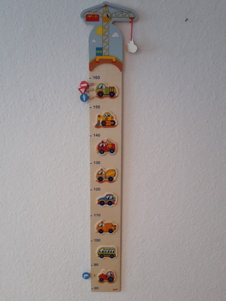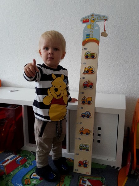 Die Mutti ist durch Zufall auf eine Messlatte für Benni gestoßen. Jetzt wo er sich nur noch in der Senkrechten bewegt, kann die Größenbestimmung beginnen. Wie es sich für Benni gehört werden das Mama und Papa standesgemäß mit seiner neuen Auto-Messlatte durchführen. Bennis Augen leuchteten beim Auspacken des Paketes. Die Mama hat die gleich montiert und ihn so gleich einmal gemessen. Benni ist jetzt ca. so groß wie ein halber Traktor (ca. 85-87cm) 😉