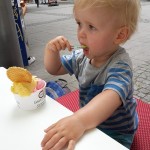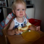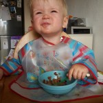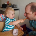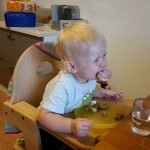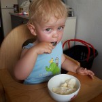 Essen Hier gibt es, wie schon in den vergangenen Monaten, überhaupt nichts zu beanstanden. Benni isst nach wie vor für sein Leben gern. Er kann eigentlich 24 Stunden am Tag essen 😉 Dabei ist er gar nicht mäkelig, isst einfach alles oder probiert es zumindest. Ganz oben auf der Liste seiner Lieblingsessen stehen natürlich Nudeln mit Tomatensauce, Kekse und Würstchen mit Ketchup. Aber auch Mamas Hausmannskost schmeckt ihm super und er verlangt immer wieder Nachschlag 🙂 Besonders stolz sind Mama und Papa darauf, dass ihr Spatz schon so super alleine essen und trinken kann. Er isst für sein Alter extrem sauber und ordentlich. Benni achtet penibel darauf, dass kein Essen über den Tellerrand kommt. Fällt doch einmal etwas auf sein Lätzchen oder herunter, wird es sofort mit „uppala“ kommentiert. Erst wenn alles beseitigt ist, wird weiter gegessen 😉 Auch möchte er am Liebsten alles mit Gabel und Löffel essen – auch wenn ein ganzes Brötchen, ein großes Stück Kuchen oder ein Würstchen auf dem Teller liegt 😉