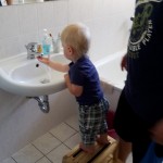 Die Mama übt mir ihrem Spatz seit einiger Zeit sich selber mit dem Waschlappen zu waschen. Erste Erfolge sind bereits zu erkennen 😉