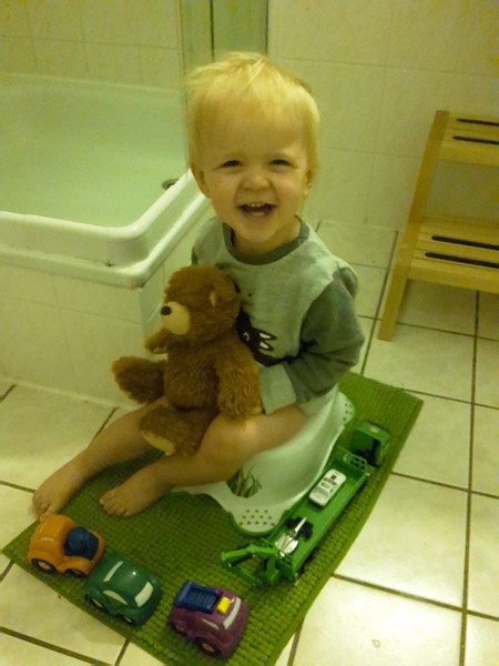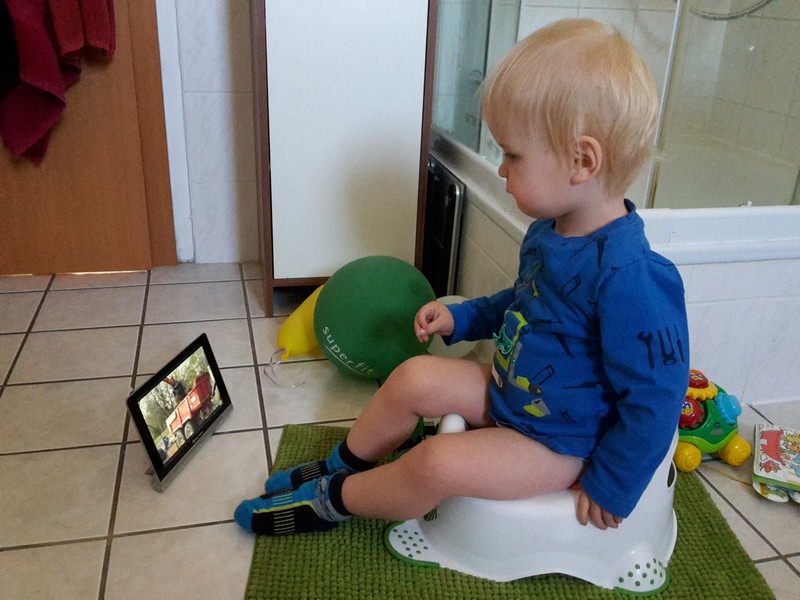Benni und seine Autos – das ist schon faszinierend. Seit Längerem sind diese aber eine große Hilfe geworden, wenn es darum geht, dass er auf sein Töpfchen soll. Bevor es ins Bad geht, darf er sich 2 Autos (eine für jede Hand) aussuchen und mit nehmen. Das ist schon richtig in Fleisch und Blut bei ihm übergegangen, sodass er sofort nach dem Essen zu seinen Autos flitzt. Dabei leg er das „Auto-Mitnehmen“ sehr großzügig aus. Das geht soweit, dass er ganze voll beladende Kipper oder ganze Autotransporter mit aufs stille Örtchen schleppt. Natürlich fallen dann auf dem Weg dorthin einige Autos herunter, was dann in großem Geschrei endet und das Töpfchen als eigentliches Ziel erst spät erreicht wird 😉