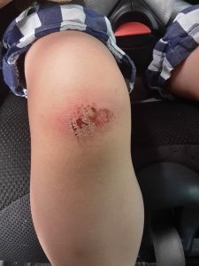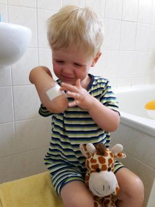 Der Benni turnt und klettert jetzt immer mehr und wilder. Da bleiben kleinere und größere Blessuren leider nicht aus. Das Kurze-Hosen-Wetter erleichtert das natürlich auch 🙁 So kam Benni erst letzte Woche mit einem aufgeschürften Knie aus der Krippe, welches natürlich ausgiebig mit Pflastern versorgt wurde. Vor einigen Tagen im Zoo bekam er beim Rutschen eine Brandwunde am Elenbogen (Mama und Papa wissen bis heute nicht wie das passiert ist). Auch da musste zu Hause sofort ein großes Pflaster drauf. Und jetzt am Freitag schon wieder. Er ist wieder hingefallen und wieder auf das zuvor schon aufgeschürfte Knie. Es blutete zu Hause ganz schön und das Pflaster war im nu durchgeweicht. Benni wollte es auch nicht so recht beugen und Jedem, den er zu Gesucht bekam wurde seine Verletzung „präsentiert“. Sogar alle seine Kuscheltiere mussten einmal pusten und ihn Bemitleiden. Aber so schnell wie die Verletzungen gekommen sind, sind sie auch wieder weg – zumindest aus Bennis Kopf 😉