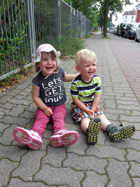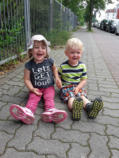 Letztes Wochenende waren Mama und Papa mit ihrem Spatz ganz spontan bei Freunden in Hannover zu Besuch. Bereits ein Jahr zuvor waren sie schon einmal zu Besuch dort. Das Wetter sollte leider alles andere als schön werden, aber alle machten das Beste daraus. Benni verstand sich mit Sophie (5 Jahre), wie nicht anders zu erwarten, von Anfang an blendend. Kaum angekommen verschwanden die Beiden im Kinderzimmer und spielten ganz toll und lieb miteinander. Durch den blöden Dauerregen konnten sie leider bis zum späten Nachmittag nicht raus und so nutzte Benni die zeit noch für ein kurzes Nickerchen. Wieder erwacht gab es dann noch ein lecker Eis, ehe alle Kinder ihre Matschuniform anbekamen und es endlich raus gehen konnte. Natürlich wollte Benni mit seinem Laufrad umher düsen und so ging es dann auf den nahe gelegenen kleinen Spielplatz. Dort tobten sich beide Mäuse ordentlich aus, stapften durch jede noch so kleine Pfütze und fuhren mit ihren Laufrädern hindurch. Am Abend nutzten die Papas die kurze Regenpause um schnell ein Paar Würstchen und Toasts zu grillen – natürlich unter den kritischen Blicken von Sophie und Benni. Nach so viel Bewegung langten Beide ordentlich zu. Am späten Abend ging es dann nach kurzer Katzenwäsche und Zähne putzen ab ins Bettchen. Benni war noch sehr aufgewühlt und fand nur sehr schwer in den Schlaf.