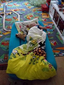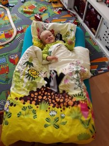 Am frühen Abend dann ging es dann wieder zurück in die Wohnung. Trotz des langen Tages fuhr Benni ohne Theater die ganze Strecke ganz toll und lieb komplett alleine. Wieder angekommen klagte er leider wie schon so oft über Poposchmerzen und jammerte sehr viel. Da es beim Abendbrot nicht besser wurde ging es aufs Klo. Und man merkte sehr schnell, dass er wieder Verstopfungen hatte. Nach einiger Zeit schrie Benni nur noch wie am Spieß, sodass er sofort abgeführt werden musste. Er war völlig platt und erledigt und kuschelte viel bei Mama und Papa. Am späten Abend dann wirkte die Medizin dann endlich, sodass er nach heftigstem Geschrei endlich sein großes Geschäft verrichtete – knüppelhart und nicht wirklich viel. Benni war völlig durchgeschwitzt und so wurde er nur kurz mit dem Lappen abgewaschen, ehe es dann sofort ins Bett ging. Nach einer kurzen Gute-Nacht-Geschichte und ein wenig Musik schlief er dann auch sofort ein und die Mama gleich mit.