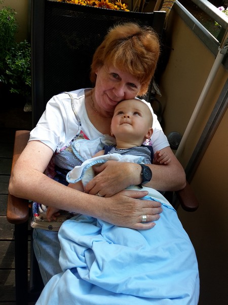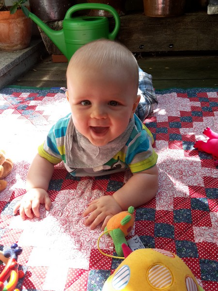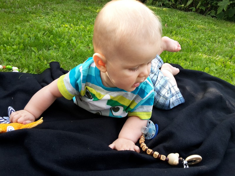 Heute waren Mama und Papa mit Benni den Tag über bei Omi Ute und Opi Roland. Er war, wie nicht anders zu erwarten, bester Laune – spielte und quiekte nach Lust und Laune. Auch seinen Mittagsschlaf absolvierte er wie ein großer Junge. Nach einem ausgiebigen Wachkuscheln mit der Omi wurde emsig gespielt und sein leckerer Nachmittagsbrei verspeist. Am Nachmittag ging es für den Benni noch eine große Runde mit dem Kinderwagen spazieren. Im Garten erkundete er voller Neugier den Rasen und guckte alles mit seinen Stauneaugen an. Es war dann auch wenig verwunderlich, dass Benni nach solch einem aufregenden Tag am Abend einen Bärenhunger hatte und sehr schnell ins Traumschlummerland entschwand 🙂