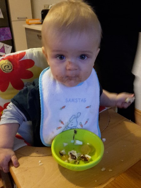 So langsam avanciert der Benni zu einem echten Nutella-Monster. Er hatte letztes Wochenende von Oma und Opa das erste Mal Nutella auf sein Hörnchen bekommen und war natürlich begeistert. Seitdem gibt es jetzt fast jeden Morgen und Nachmittag Einback oder Hörnchen mit Nutella. Dementsprechend sieht dann auch Benni bzw. die Küche aus 😉