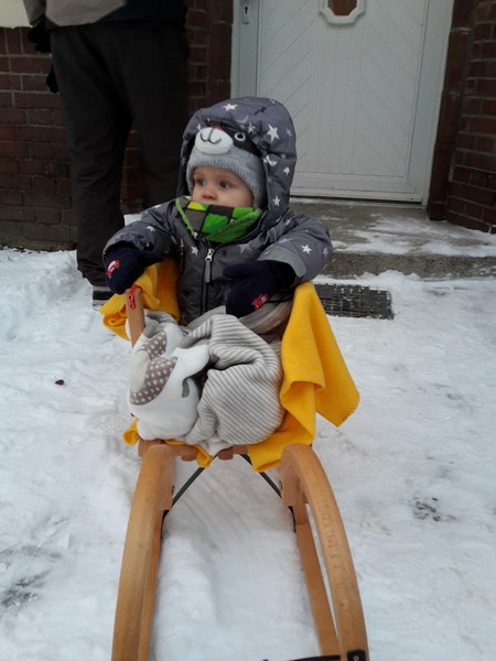 Da es in den letzten Tagen endlich einmal geschneit hatte, konnte der Benni seinen ersten Schnee inklusive Schlittenfahrt erleben. (letzten Winter hat es in Hannover auch geschneit, aber den hat er konsequent verschlafen 😉 ) So ging es am Nachmittag gleich raus den neuen Schlitten einweihen. Noch schnell den Kleinkindaufsatz befestigt und dick eingemummelt und los ging es. Benni hing etwas lustlos auf dem Schlitten herum, aber staunte und guckte mit seinen großen Kulleraugen. Seine Laune besserte sich zusehend, sobald Mama und Papa den Turbo einlegten. Nach einer kleinen Runde ums Haus war dann auch genug und nicht nur Benni ganz schön durch gefroren 😉