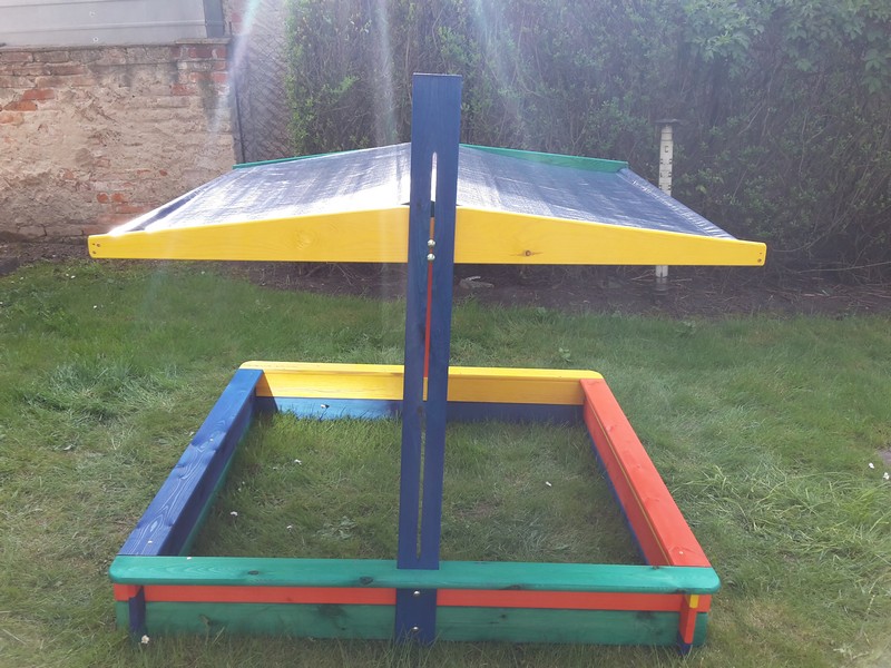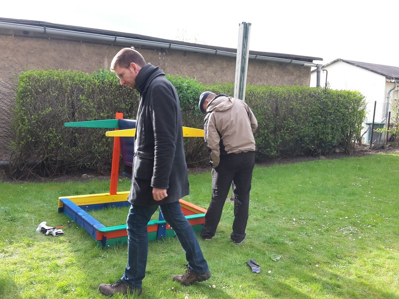 Letzte Woche haben Mama und Papa zusammen mit 3 anderen Familien aus dem Haus einen tollen neuen bunten Sandkasten erworben. Kaum geliefert haben die Männer sich gleich ans Werk gemacht und ihn aufgebaut. Natürlich unter den wachsamen und kritischen Augen der Mamas 😉 Das Ergebnis kann sich sehen lassen. In den nächsten Tagen wird noch die Folie angetackert und der bereits gekaufte Sand eingefüllt. Somit können die Mäuse dann direkt hinterm Haus buddeln und spielen 🙂