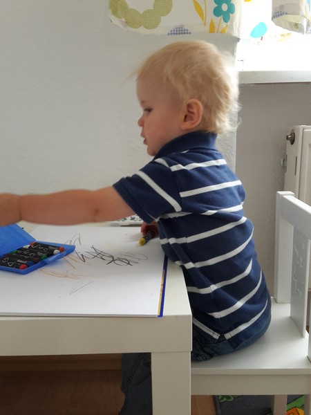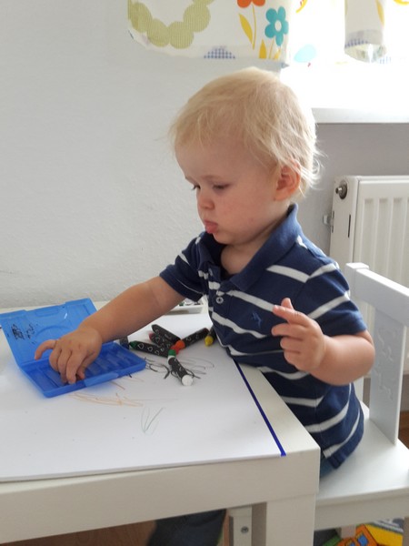 Kleiner Künstler August 4, 2016 | Friederike Mühler Benni hat in den letzten Tagen das Malen Kritzeln für sich entdeckt. Er kommt immer wieder an und möchte etwas zu Papier bringen. Er setzt sich schon ganz alleine auf sein Stühlchen und los geht’s.