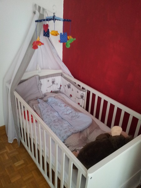 Mama und Papa haben es wirklich gewagt – sie haben ihren Benni letzte Nacht aus dem Schlafzimmer „geschmissen“. Sie wollten zumindest langsam probieren, dass er in seinem eigenen Bettchen in seinem Kinderzimmer schläft. Und was soll man sagen – die erste Nacht hat ganz prima funktioniert. Mama und Papa brachten Benni nach einem ausgiebigen Vollbad gegen 8 Uhr am Abend ins Bett. Er kämpfte noch gut eine Stunde gegen sein Bauchweh, ehe er endlich eingeschlafen war. Die Mutti ging diesmal auch nicht sofort mit ihm zusammen ins Bett. Jaja hätte sie machen sollen – aber sie dachte, dass er eh gleich wieder aufwachen würde. Dem war aber nicht so. Benni ratzte lieb und kam nur einmal in der Nacht und einmal am Morgen. Mama und Papa fanden das für den Anfang mehr als ordentlich. Wenn das weiter so gut läuft, zieht der Papa ganz bald wieder zurück zur Mama ins Schlafzimmer 🙂
