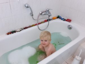 Der Benni badet nach wie vor jeden Abend und das super gerne. Zum Abschuss des Badens lässt er dann immer das Wasser heraus und beobachtet dann ganz genau den dabei entstehenden Wasserstrudel. Einfach köstlich mit anzusehen 🙂