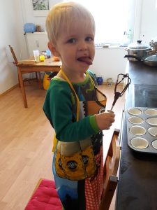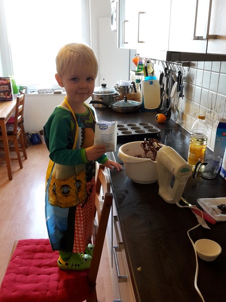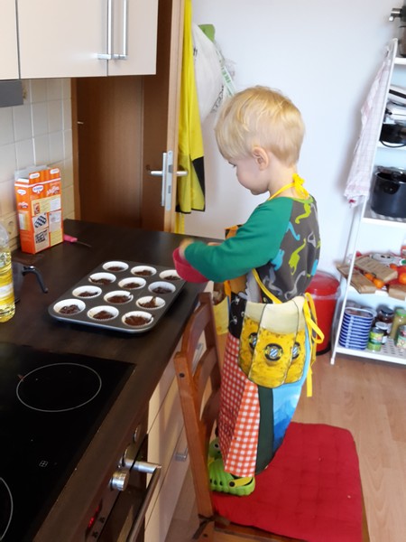 Letztes Wochenende hat die Mama mal wieder Muffins gebacken. Dieses Mal wollte Benni der Mama unbedingt helfen. Schürze umgebunden und auf den Stuhl hoch gekrabbelt ging es dann los. Benni schüttete alle Zutaten wie ein Profi in die Rührschüssel. Zusammen mit der Mama alles schön verrührt kleckerte er dann alles in die Förmchen. Zum Schluss verteilte er dann noch die Schokoflocken auf jedes Förmchen. Naja, sagen wir mal er zählte sie förmlich ab. Die Mama hatte ihm zuvor versprochen, dass er, wenn noch Flocken übrig bleiben sollten, sie dann aufessen darf. Es landeten so mehr Schokoflocken in Bennis Mund als auf den Muffins 😉